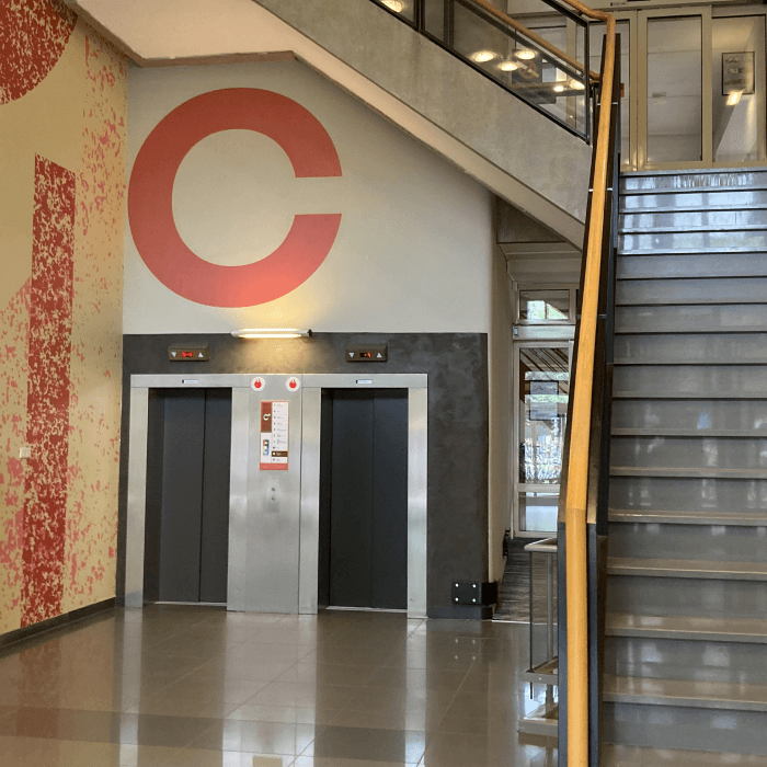 De hoofdingang is de beste optie als je met het OV, of de fiets bent. Deze is direct vanaf het stationsplein bereikbaar. Pak vanuit de entree de lift naar de zevende verdieping en sla rechtsaf de gang van vleugel C in. Loop net zo lang door tot je unit 062 tegen komt.
